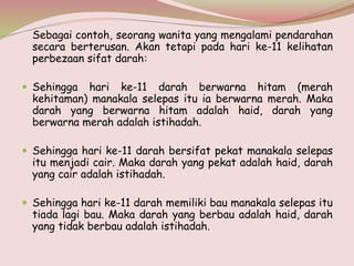 Darah haid sifatnya keras sedangkan istihadlah lunak. Darah nifas akan keluar setelah melahirkan hingga 6 minggu lamanya. Selama tiga sampai sepuluh hari pascapersalinan seharusnya darah nifas akan berwarna merah terang dan pekat warnanya akan semakin.